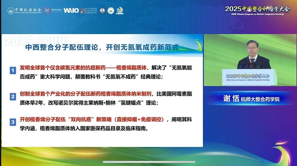 谢恬教授在报告中分享了团队提出的中西医整合“分子配伍”理论研发新药及治疗癌症,经过20多年攻关研发成功全球首个分子配伍抗癌新药、全球首个碳氢元素新药、全球首个产业化的脂质体纳米制剂——无氮无氧抗癌新药榄香烯脂质体(榄香烯乳状注射液、榄香烯口服乳等)。该成果颠覆了诺贝尔奖得主Linus Carl Pauling和教科书“无氮氧不成药”的经典理论,解决了“无氮氧能否成药”的重大科学问题,开创了碳氢化合物成药新范式。
