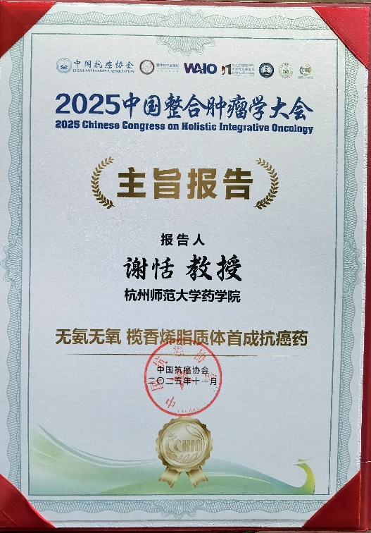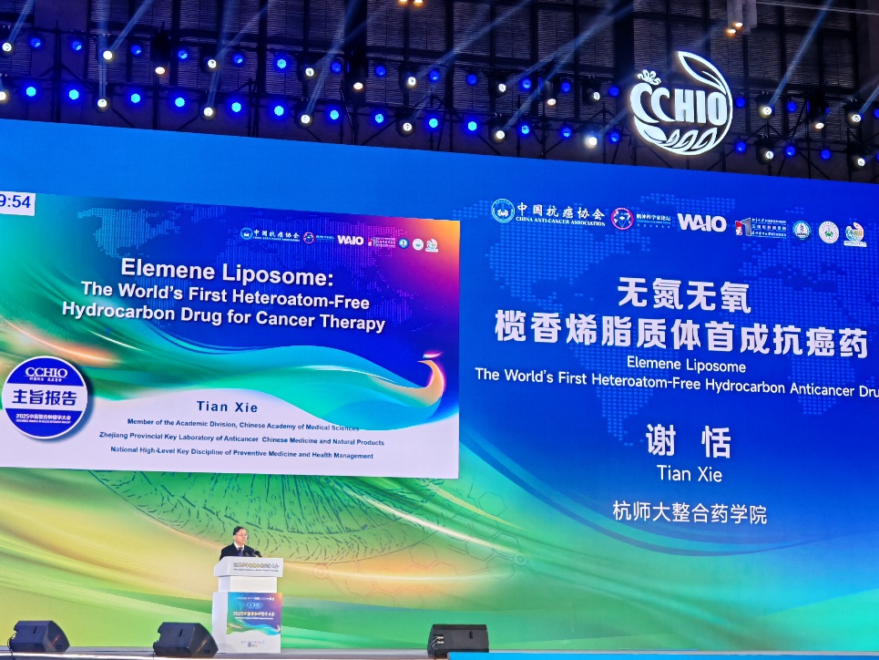 开幕式上最引人注目的,是从全国200余位学者专家经过层层选拔,9位学者脱颖而出带来的全英文主旨报告。在数千学者的见证下,他们站上全球直播的舞台,用国际通用的语言,发出了肿瘤医学研究的“中国最强音”,标志着中国智慧正自信地引领世界前沿对话。中国抗癌协会中西整合肿瘤专委会创始主任委员,中国抗癌协会中西整合控瘤新药专委会主任委员、杭州师范大学整合肿瘤学研究院院长、中国医学科学院学部委员、国家岐黄学者谢恬教授作为主旨报告专家,作了题为《Elemene Liposome: The World’s First Heteroatom-Free Hydrocarbon Drug for Cancer Therapy》(无氮无氧——榄香烯脂质体首成抗癌药)的精彩英文学术报告。